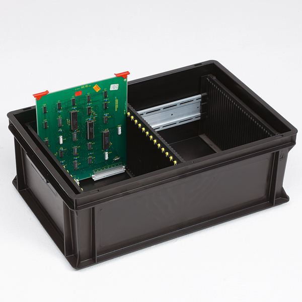 Fornecemos prateleiras impressas com dimensões que se ajustam aos tamanhos internos dos nossos recipientes para manuseamento de PCB (placas de impressão). Consistem de placas de grelha condutoras de eletricidade com ranhuras de 2 ou 3 mm de profundida sobre um ou dois lados que estão bem aparafusadas entre 2 perfis de ranhuras.