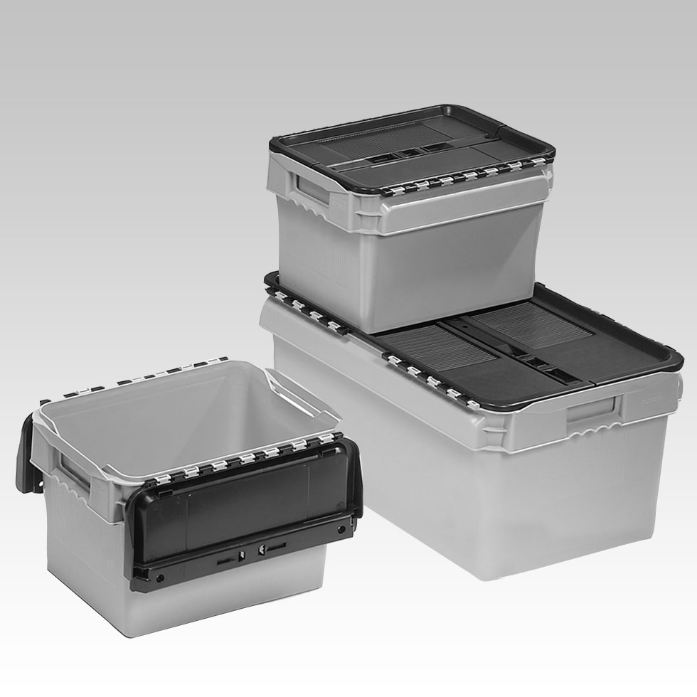 Todas as caixas destinadas à distribuição podem assim ser empilhadas umas nas outras, eventualmente com a ajuda de estruturas de empilhagem. Estas caixas estão equipadas de tampas que podem ser seladas. Estas caixas são muito resistentes e podem vir equipadas com varios acessórios como uma impressão indelével, um porta-etiqueta ou um carrinho de transporte.