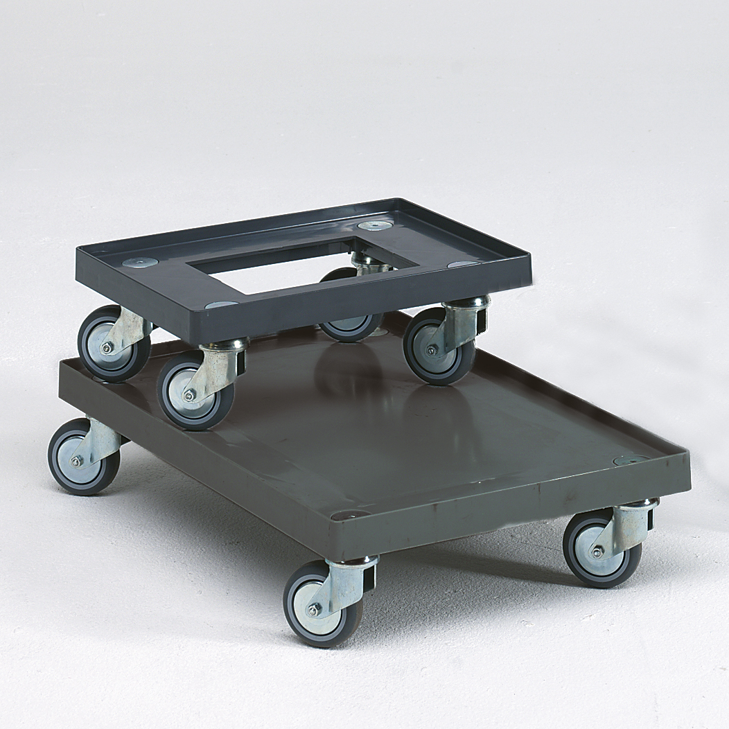 product(s)Poderá ser colocada uma plataforma rolante com 4 rodas por baixo de praticamente todas as caixas. A Engels dispõe de um vasto programa de carrinhos de transporte padrão para as suas caixas para transporte e armazenagem, com 400x300mm, 600x400 mm e 800x600 mm. Deste modo, é possível deslocar uma pilha de caixas com um só movimento.