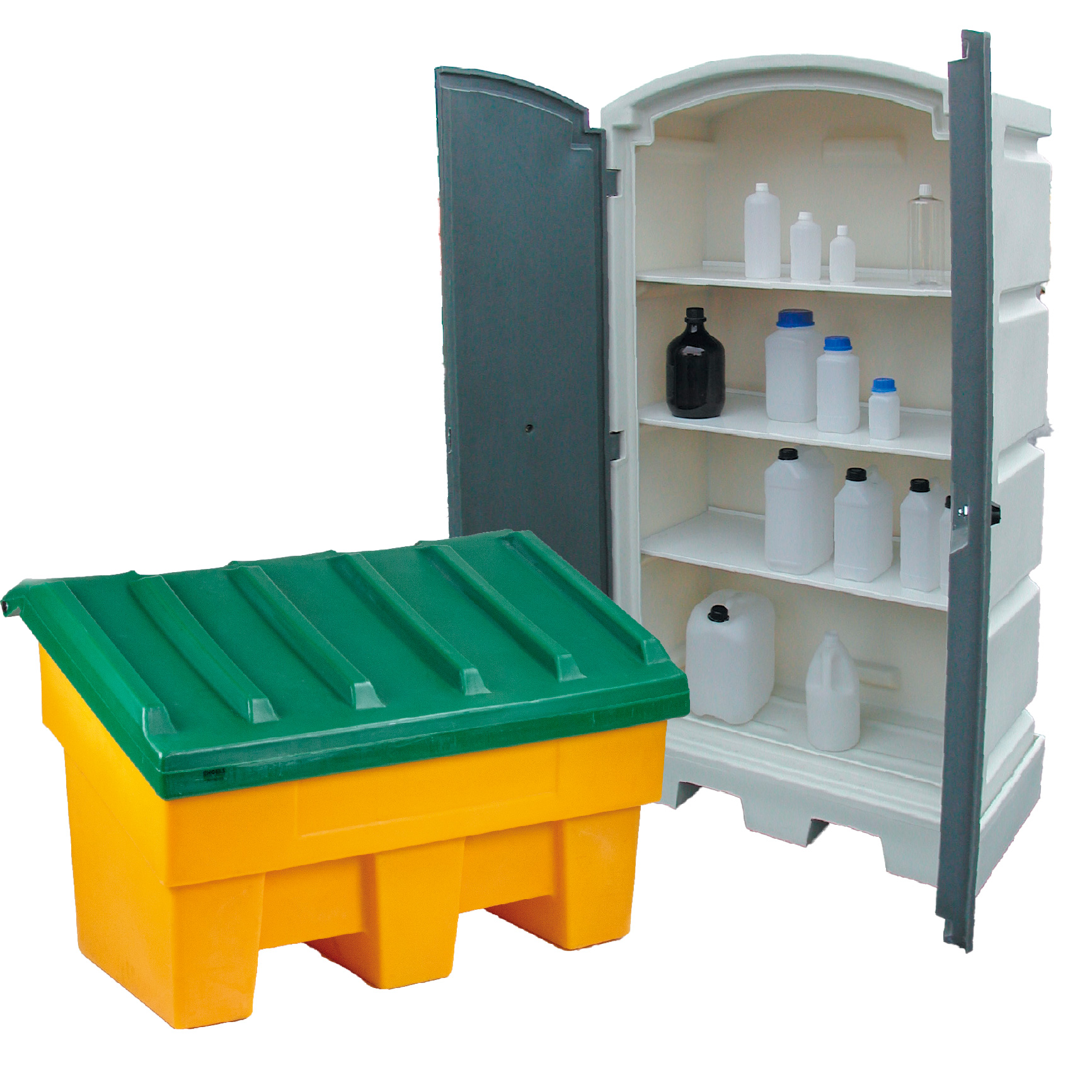 Os armários de segurança podem incluir prateleiras, tabuleiros de retenção e sistema de fecho com fechadura cilíndrica. Os armários de segurança estão indicados para a armazenagem tanto em ambientes interiores como ao ar livre. Graças à resistência química inerente ao polietileno estes armários têm uma excelente compatibilidade química mesmo para a utilização de ácidos, alcalinos e detergentes.